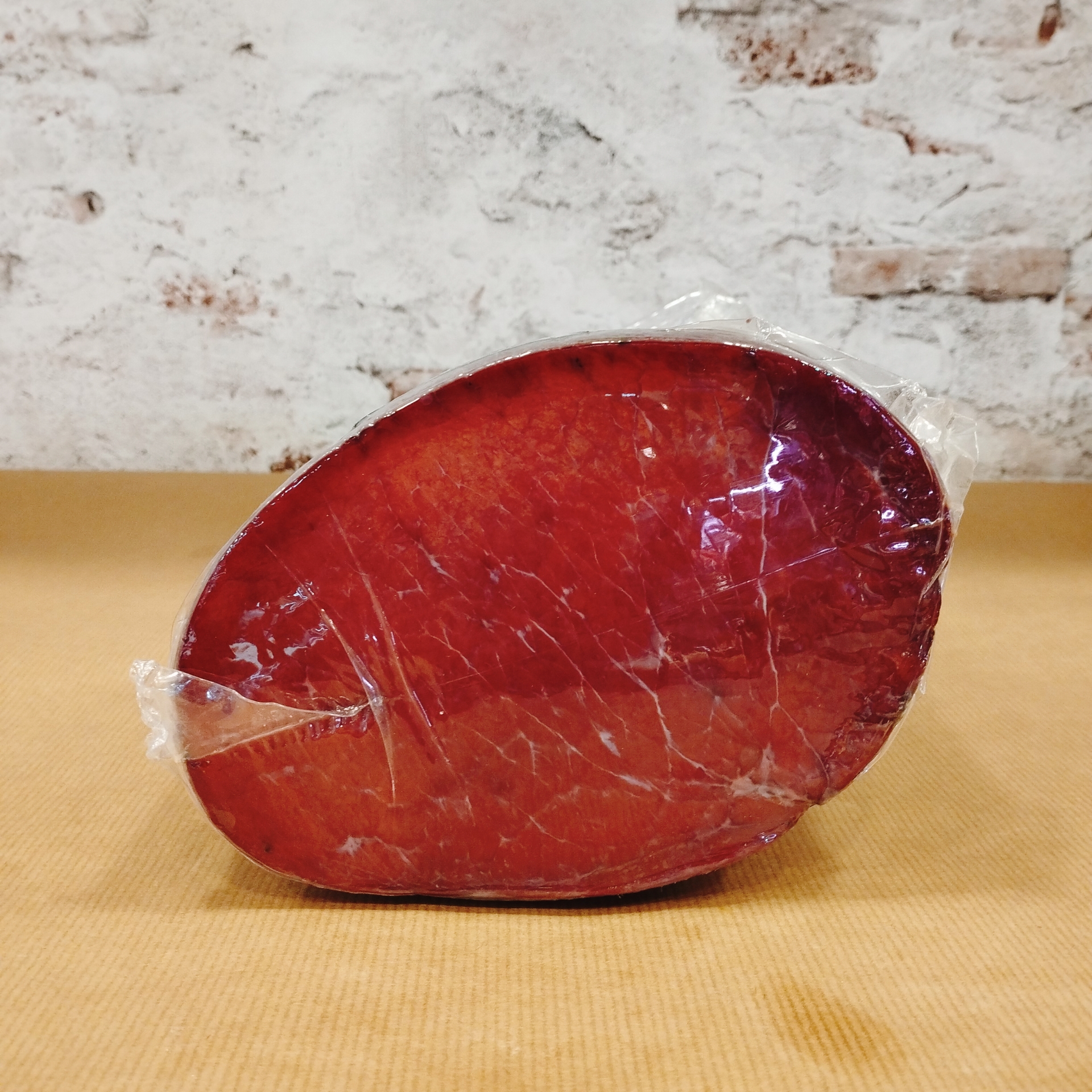 Procedente de ganado de la cadena de suministro italiana. Corte gigante de la cadera. Es la parte más interna, suave y delgada del muslo. La noble materia prima y la forma en la que se procesa garantizan un producto sano y apetitoso, con un alto contenido en proteínas. Para los verdaderos amantes de la bresaola. Con un aroma delicado.