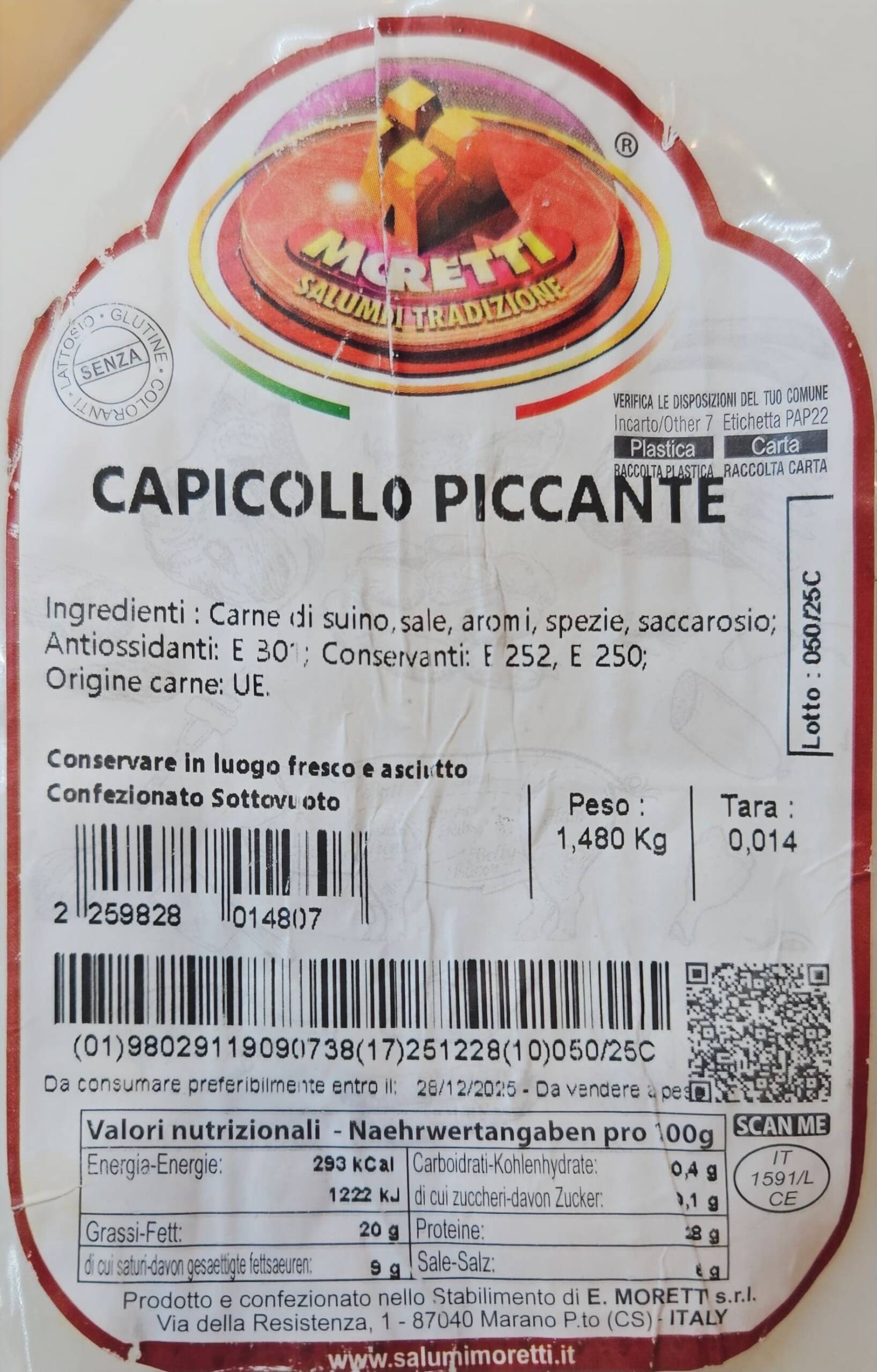 En nuestra tienda puedes comprar el auténtico Capocollo Picante de Calabria DOP, envasado al vacío para conservar toda su frescura y aroma. Disfruta en casa de uno de los embutidos más icónicos y sabrosos de Italia.
