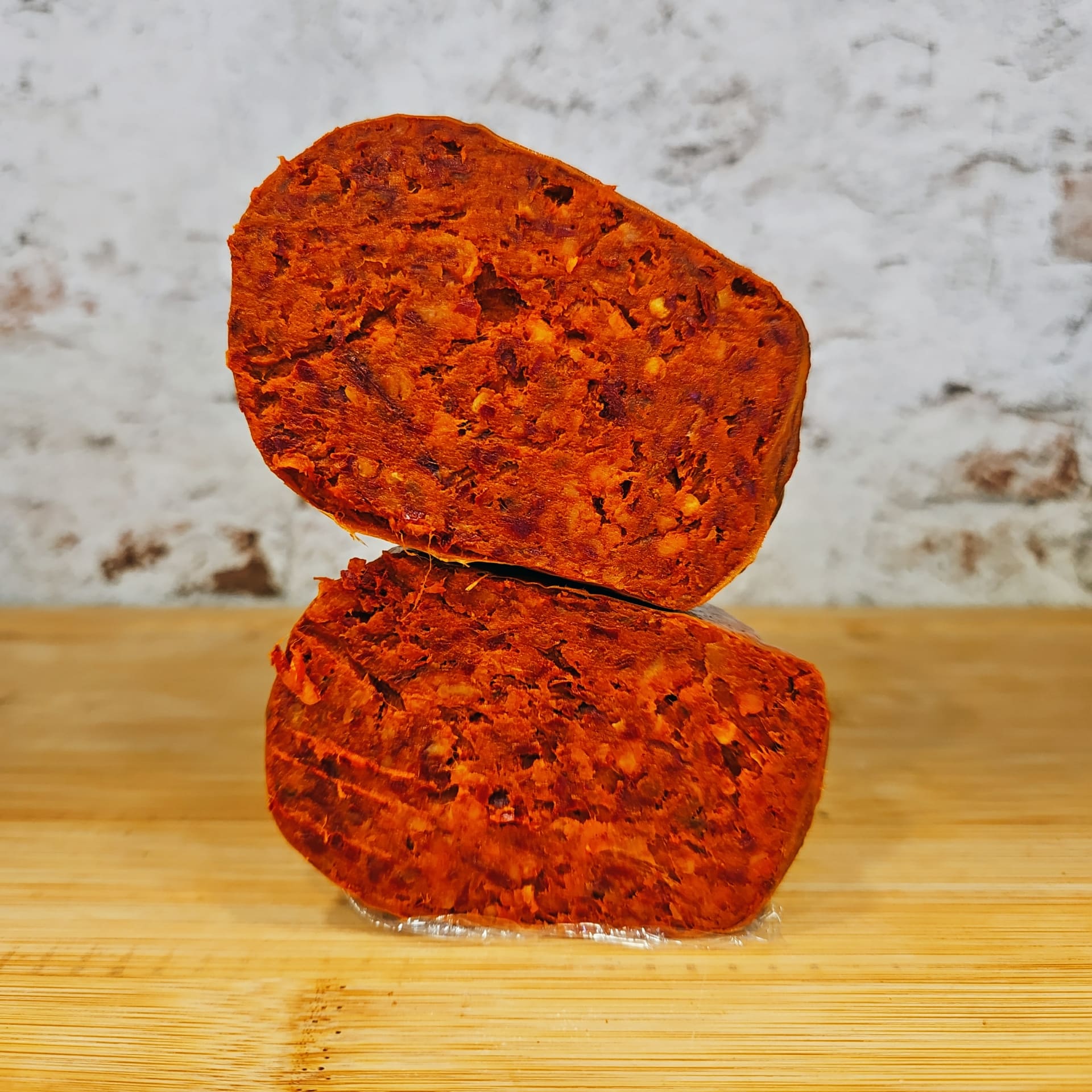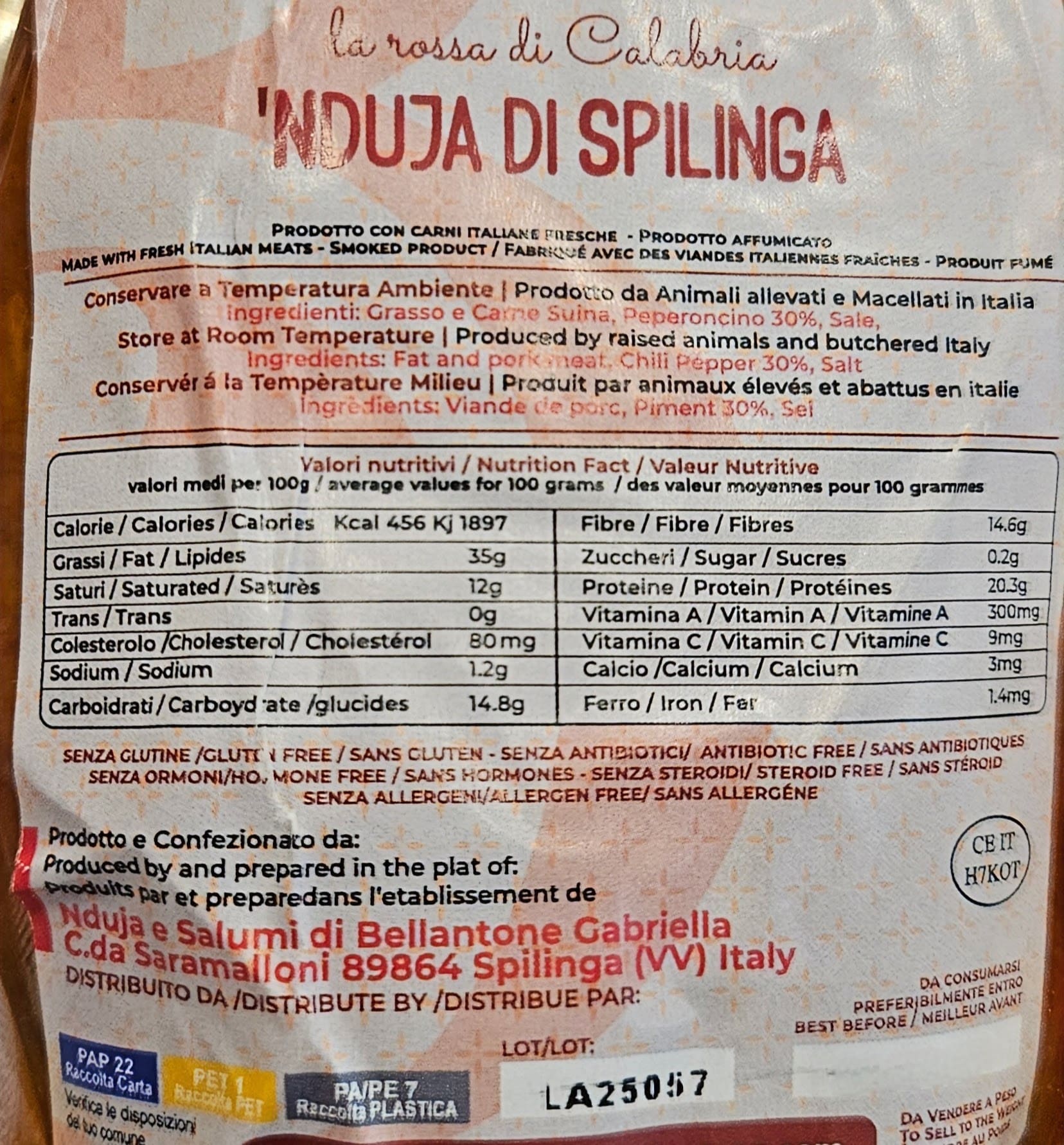 La N’duja de Calabria es parecida a la sobrasada española. Elabora con manteca de cerdo, tocino y pancetta, con la adición de peperoncino picante de Calabria secado naturalmente al sol y sal. Ideal para salsas, pizzas, brusquetas y más.