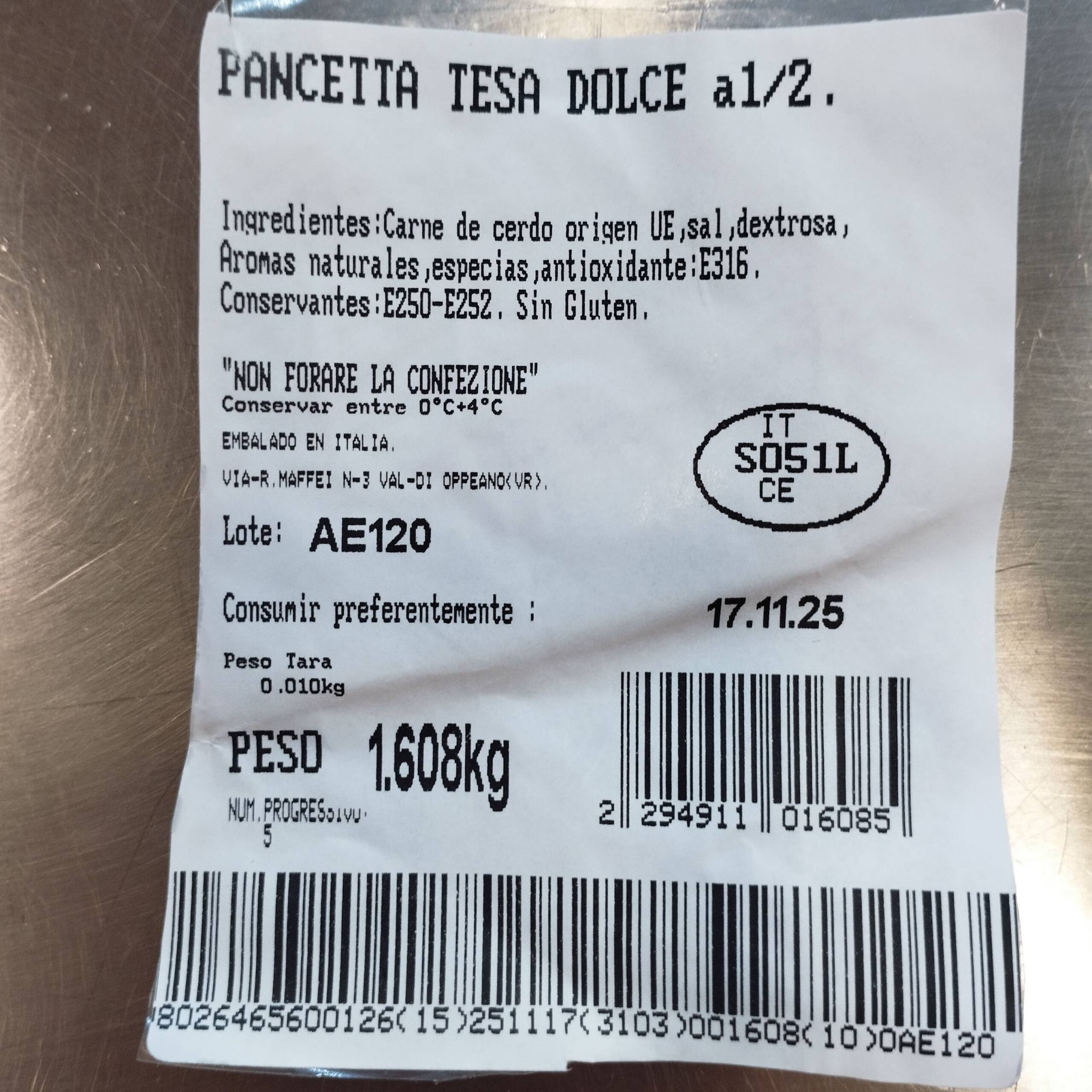 La panceta tesa se obtiene de la parte ventral magra del cerdo y se sazona mediante salazón y aromatización en seco.